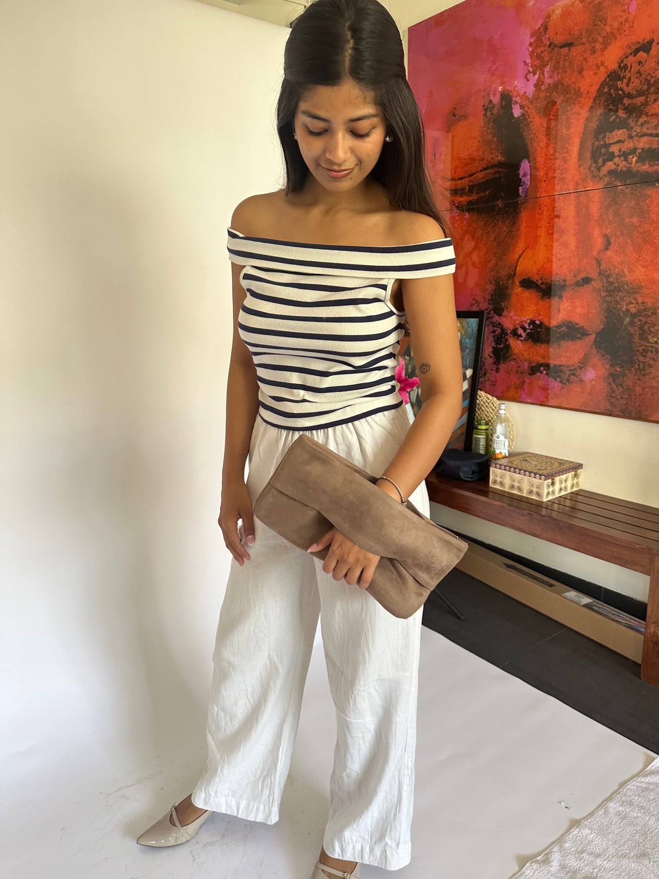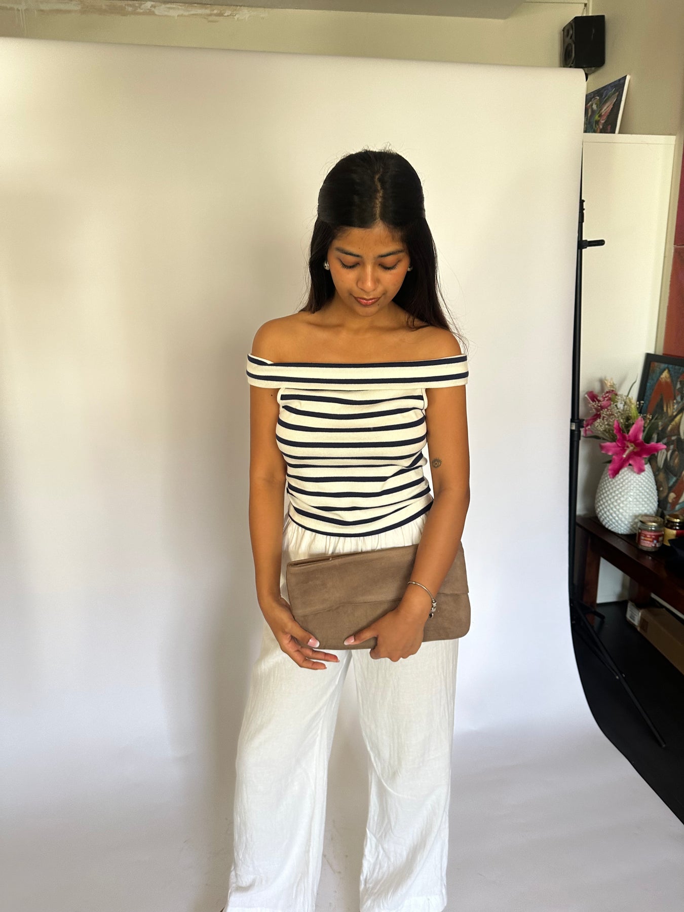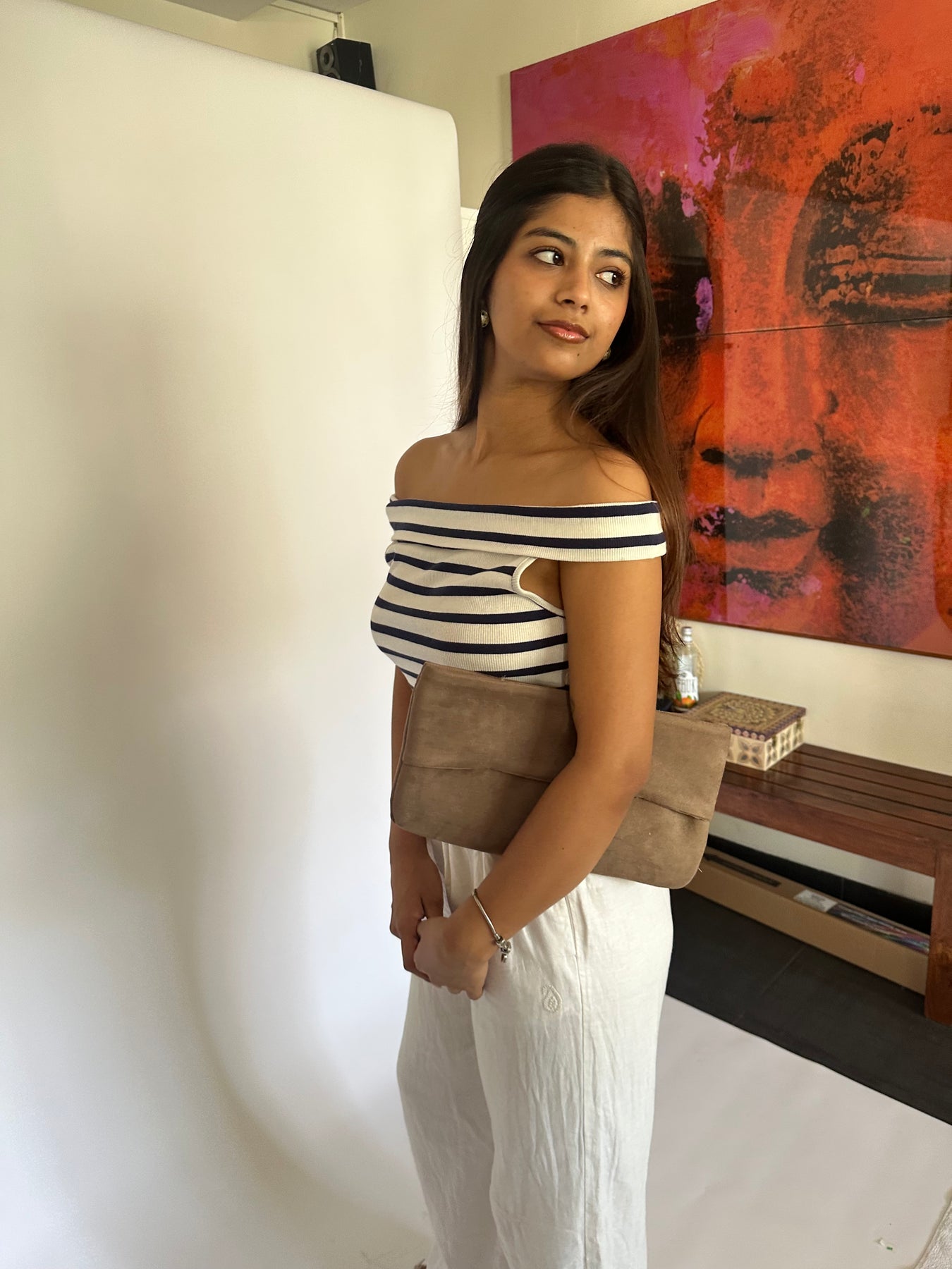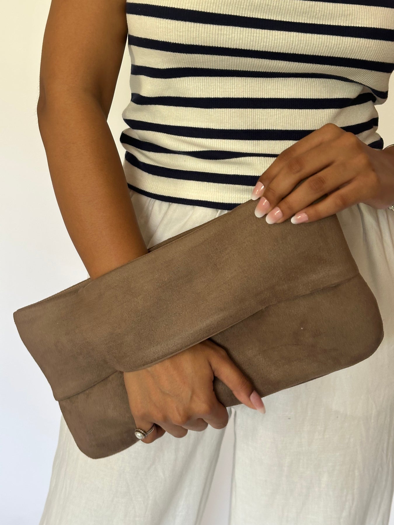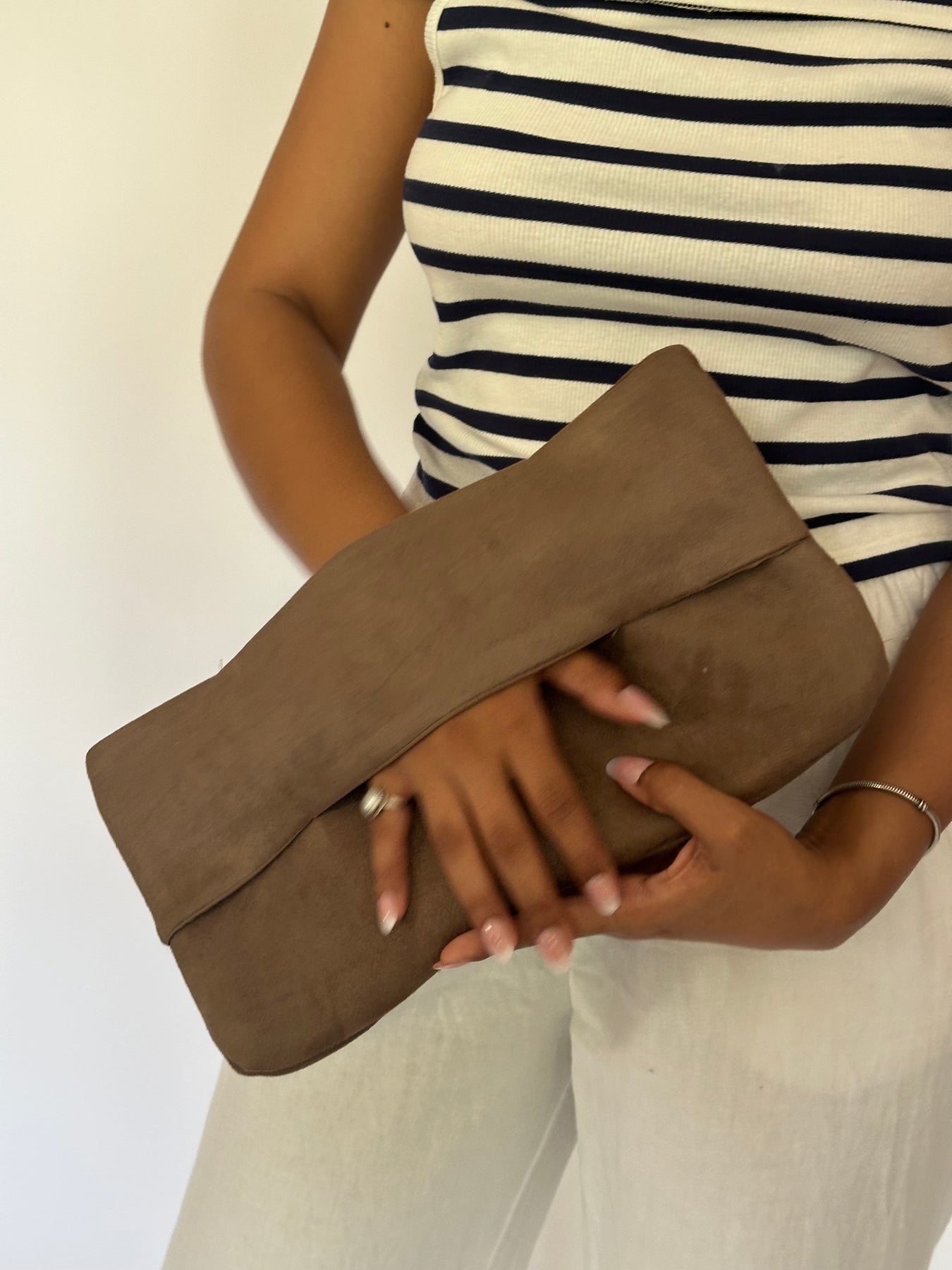 The ultimate wardrobe essential. Crafted in soft tan suede, this fold-over clutch is minimal, versatile, and works with literally everything. One bag, every mood, no overthinking required.
